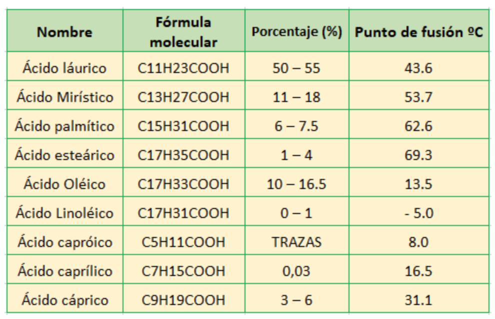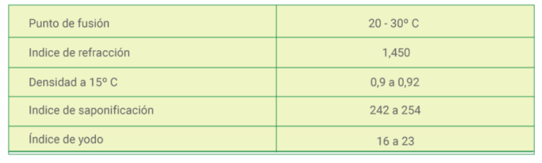 El aceite obtenido es una grasa en forma líquida o semisólida, de acuerdo con la temperatura ambiente, que contiene ácidos grasos saturados, ácidos monoinsaturados ácidos grasos poliinsaturados.